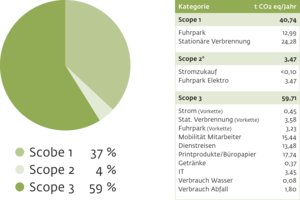 Von den Gesamtemissionen entfallen dabei 37% auf Stationäre Verbrennung und Fuhrpark (Scope 1), 4% auf zugekauften Strom und Fuhrpark Elektro (Scope 2) und