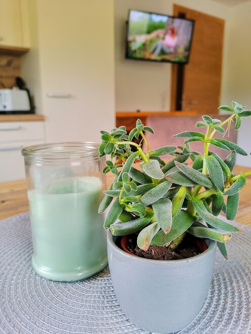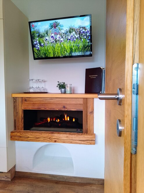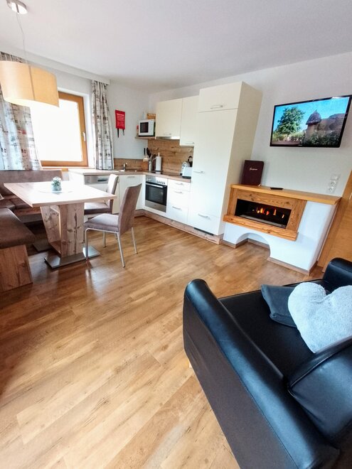 Die hochwertig, moderne Ausstattung entspricht höchste Wohnansprüche: voll ausgestattete Wohnküche mit Elektroherd, Spülmaschine, Wasserkocher, Toaster, Kühlschrank inklusive Gefrierfach, Flatscreen TV, knisterndes Effektfeuer, Mikrowelle, Kaffeemaschine, Couch und gemütlicher Sitzecke.