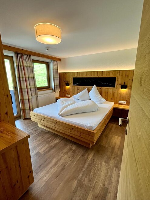 Dieses Appartement verfügt ein geräumiges Schlafzimmer mit einem Doppel- und einem Einzelbett. Ein Tiroler Fichtenholzschrank stellt eine Trennwand zwischen den beiden Betten dar und bietet so ein wenig Privatsphäre.