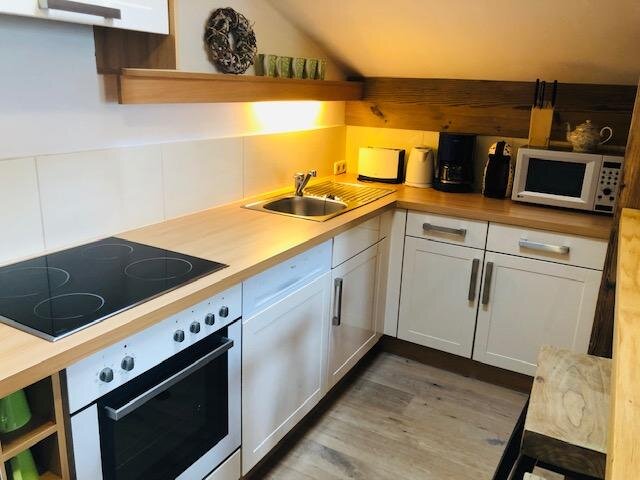 - gut ausgestatteter Küche mit Backofen, Ceran Herd, Kühlschrank mit Kühlfach, Wasserkocher, Kaffeemaschine, Geschirr