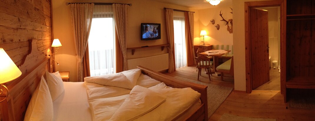 Das Zirbenholzzimmer ist ca. 22 m² groß, mit Dusche, WC, Fön, Kosmetikspiegel, Komfortbetthöhe, Schreibtisch, Safe, Flat-TV, Radio, Telefon und Balkon).