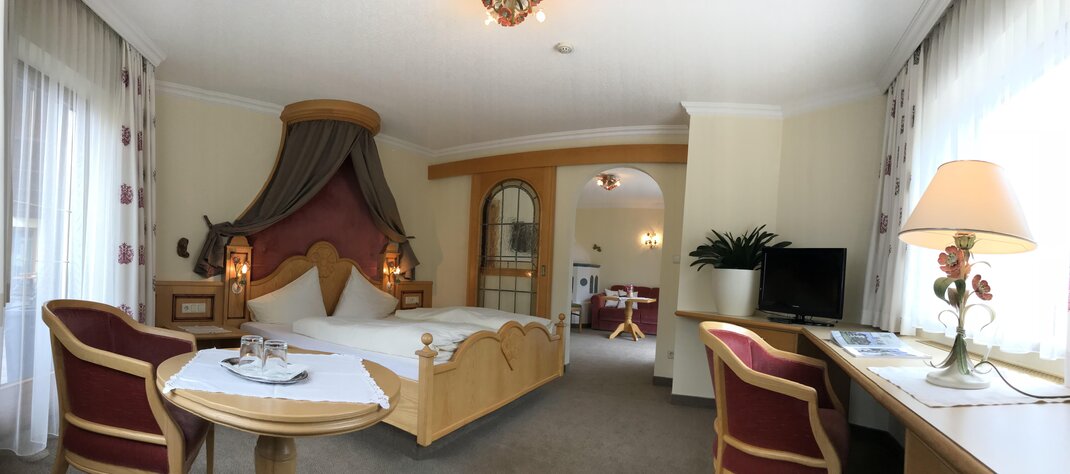 Unsere Juniorsuite "Edelweiß" ist ca. 45 m² groß, mit Bad, seperatem WC, Wohnzimmer mit Kachelofen, Wohnecke, 2 x 42" Flat-TV, Radio, Safe, Telefon, Schreibtisch, Bademäntel, Fön, Kosmetikspiegel ausgestattet und verfügt über eine Sonnenterrasse und einen Balkon.