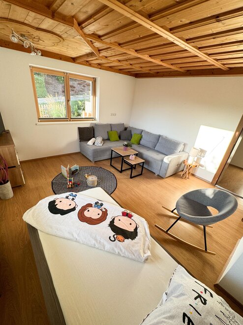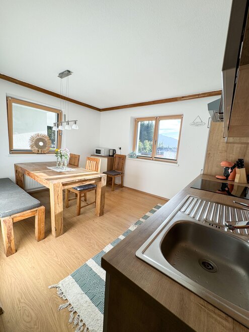 In der Küche befindet sich ein Esstisch mit Stühlen, wo alle Platz finden und in der voll ausgestatteten Küche das Essen zubereiten können. Gerne können Sie Ihr Essen oder Ihren Kaffee aber auch auf der Terrasse genießen- mit Blick auf die umliegenden Berge, die gemütlichen Terrassenmöbel laden dazu zum Verweilen ein. Ein zusätzliches Extra: Damit auch die Eltern mal in Ruhe fernsehen können, befindet sich im Schlafzimmer ein eigener Fernseher.