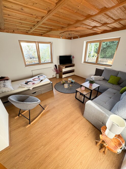 Wir besitzen zwei Gärten ums Haus, wo sich einerseits eine Feuerstelle, andererseits ein Spielplatz zum Mitbenützen befindet. Eine große Terrasse samt Mobiliar gehört zu Ihrer Ferienwohnung dazu.