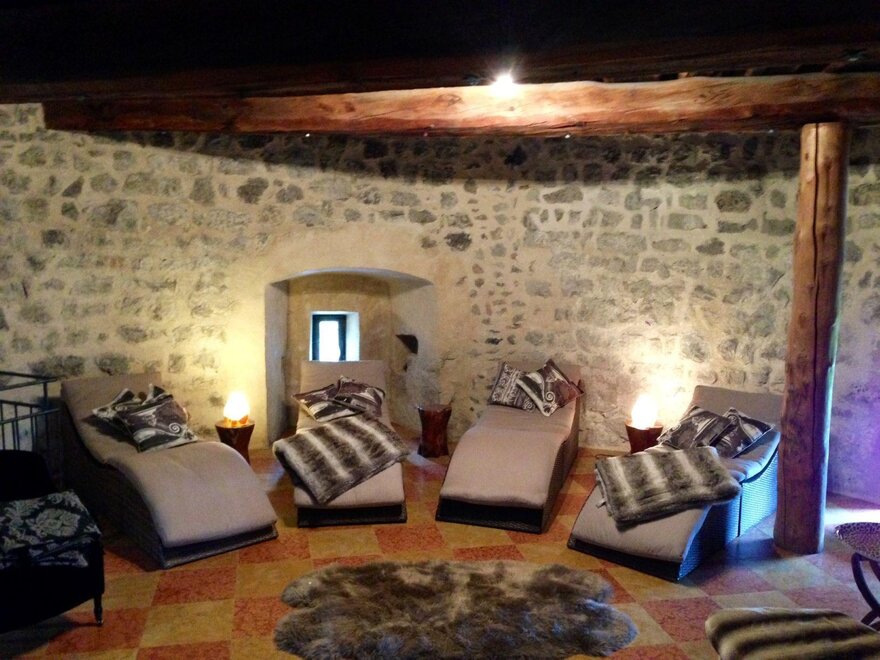 Im Interieur des alten Burgfrieds von 1167 befindet sich eine Wellness-Oase mit finnischer Sauna, türkischem Dampfbad, Gym mit Technogym Geräten und einem Ruheraum.