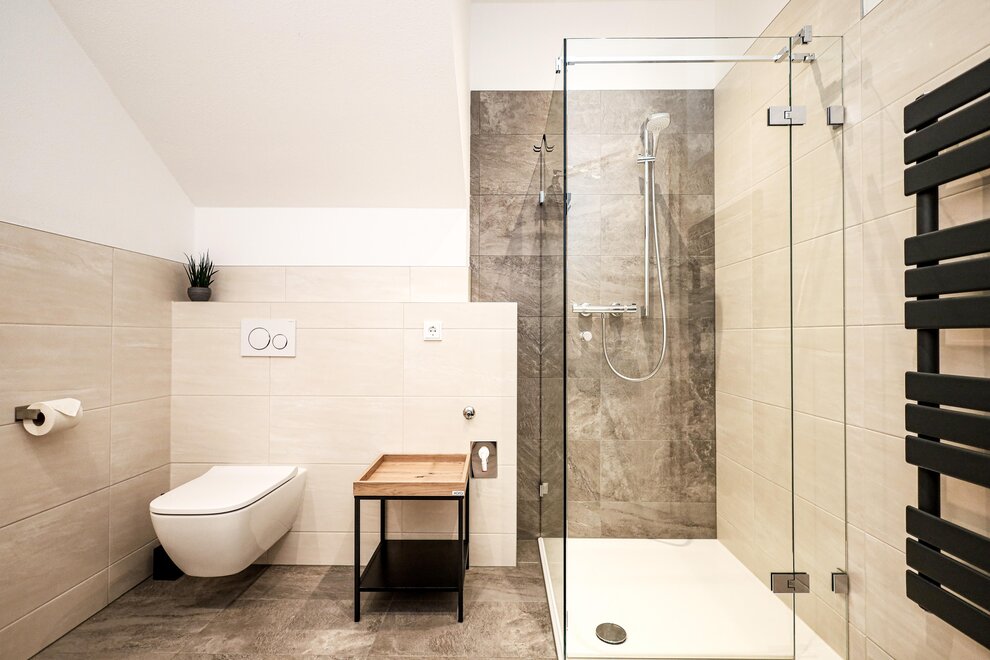 The bathroom is modern and functional, featuring a shower and a toilet.