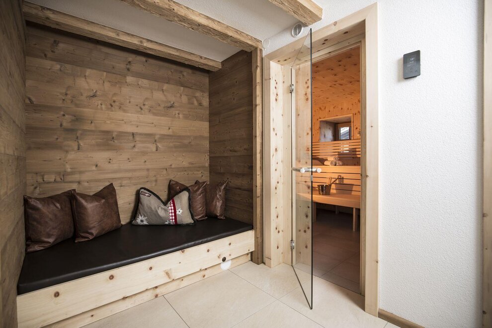 Private Swiss stone pine sauna with cozy corner by the crackling fireplace