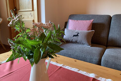 The Karin apartment is ideal for a large family. 3 bedrooms + a large living room, a spacious dining room - offer plenty of space for children or friends. Directly from the living room there is access to the balcony - with a view of the Sagtaler peaks or the Wiedersbergerhorn. From the kitchen or the children's room you can access the garden.