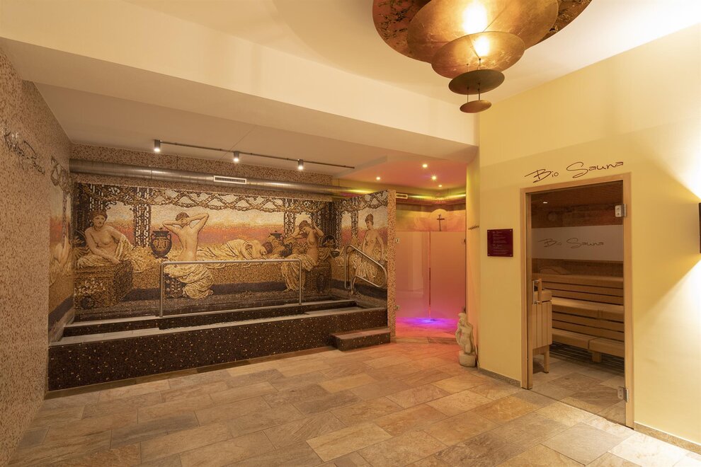 Double room and neighboring living room with tiled fireplace, radio, TV, telephone, minibar, safe, large balcony, 3rd and 4th bed available. Luxury bathroom with double tub, round shower, sauna, toilet. Approx. 60m², max. occupancy for 2 adults and 2 children (sofa bed).