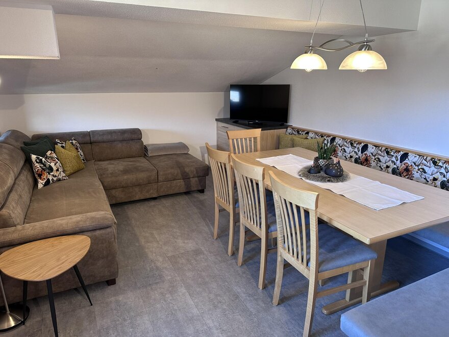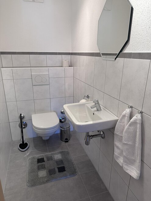 Apartment 2 is for 2-6 persons and consists of 1 double bedroom, 1 triple bedroom with double bed and single bed and 1 sofa bed in the kitchen-living room. Living room/kitchen, bathroom with shower and double washbasin, separate WC. The apartment has a balcony. The garden with deckchairs and children's playground is available to all guests incl. free parking