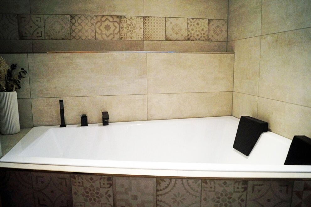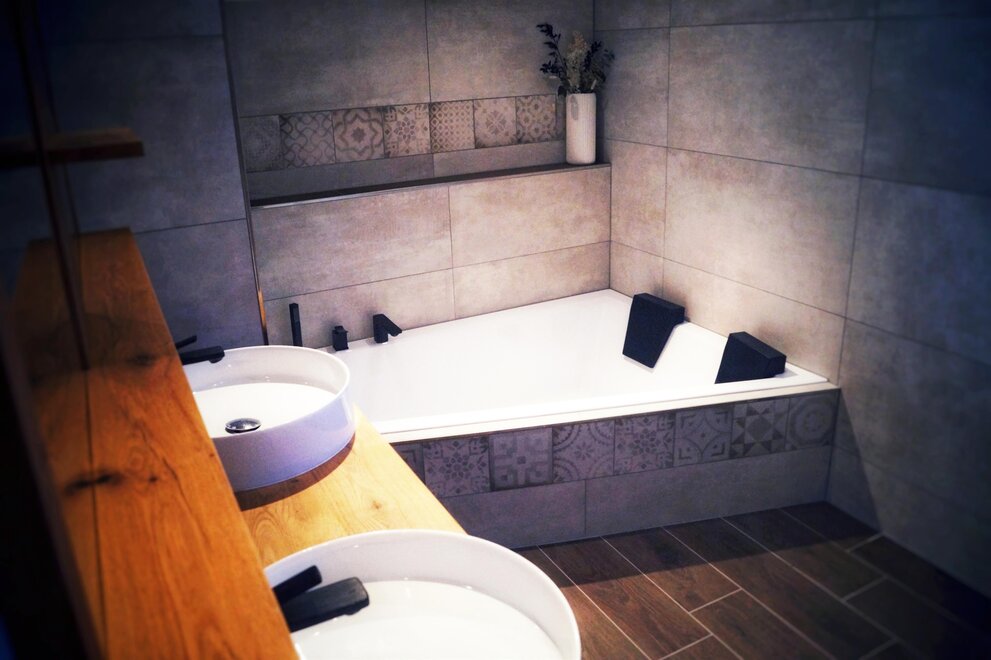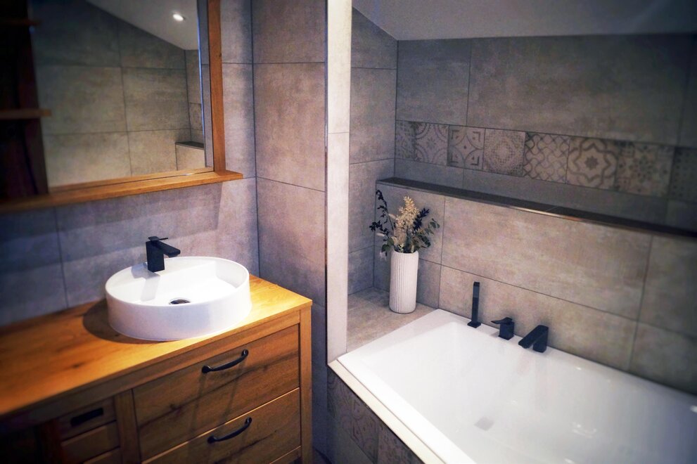 The brand new and modern bathroom is equipped with a rain shower, double bathtub, double washbasin and WC.