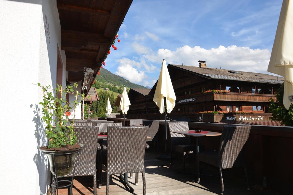 Our sun terrace with a view of the Wiedersbergerhorn offers space for relaxation, whether at breakfast, an afternoon coffee or a cozy glass of wine at sunset.