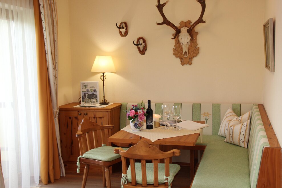 Our junior suite "Edelweiss" is about 45 m² in size, with bath, separate toilet, living room with tiled stove, living area, 2 x 42 "flat screen TV, radio, safe, telephone, desk, bathrobes, hair dryer, cosmetic mirror equipped and has a Sun terrace and a balcony. In the separate living room is a double sofa extendable and thus ideal as a family room.