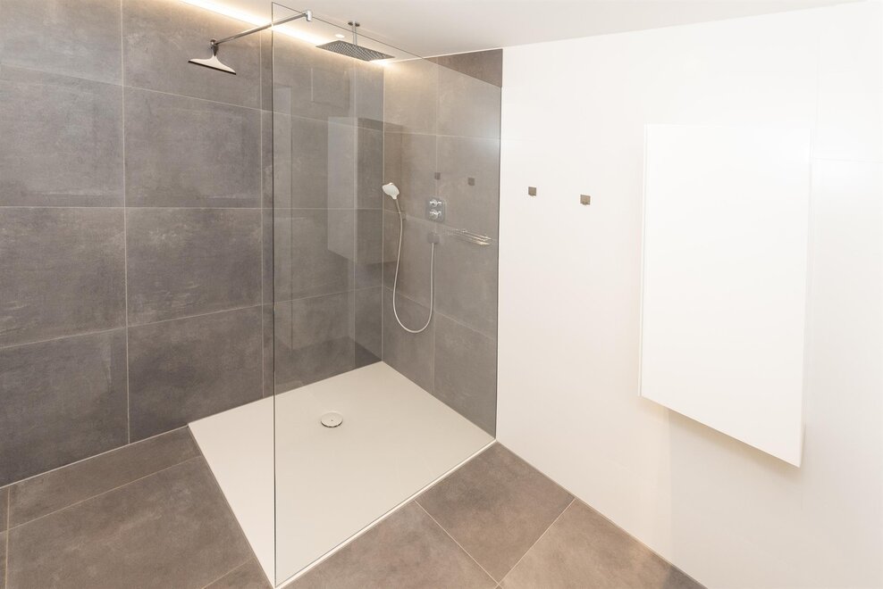 The spacious and modern bathroom features a stylish rain shower and two toilets.