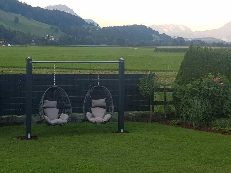 In this larger, over 60 m² apartment you live like kings. Fresh, bright colors and spaces invite you to linger. A balcony with comfortable seating offers a view of the Voldöpperspitze, the Sonnwendjoch and the adjacent fields. Relax in a spacious bathroom with a large steam shower and use the large flat screen TV to bring the evening to a close.