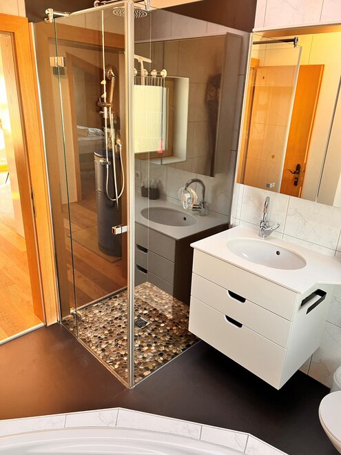 Bathroom with shower, corner bathtub and WC. Parking possibility for up to 3 cars. 400V charging possibility for electric vehicles.